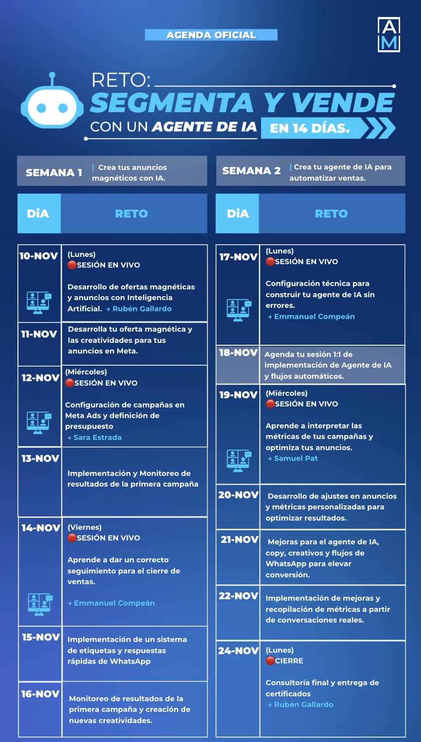 Queremos que tengas éxito en tu negocio, así que, si asistes a las sesiones en vivo, implementas el sistema paso a paso como te indicamos y en 14 días tienes funcionando tu Agente de inteligencia Artificial…